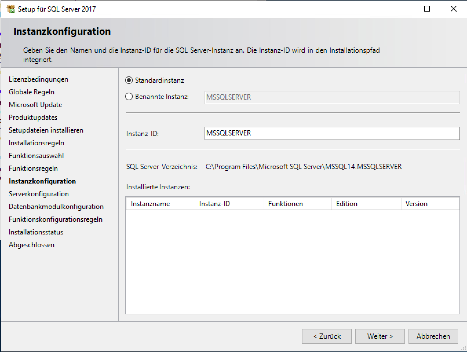 Installation Microsoft SQL Server 2017 Instanzkonfiguration Standart