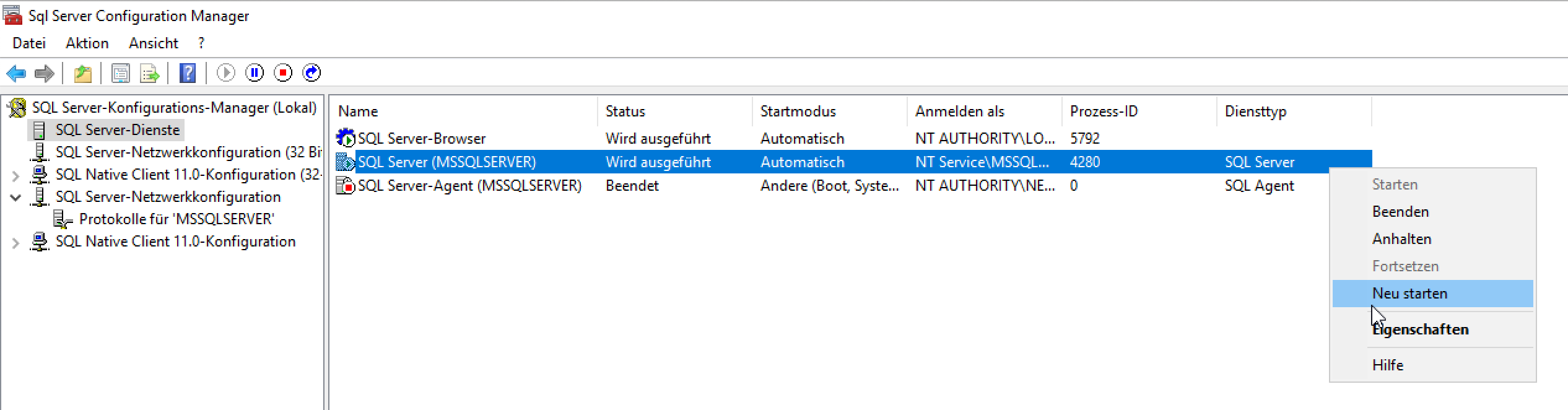 Konfiguration Microsoft SQL Server 2017 - TCP/IP Neustart